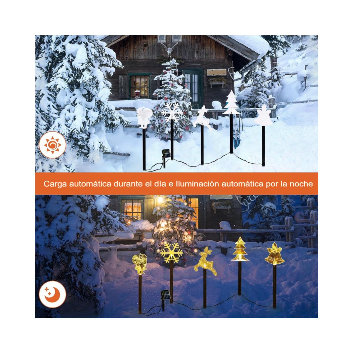 - Durabilidad Exterior: Construidas para resistir las condiciones exteriores, estas luces solares son resistentes al agua y a la intemperie, asegurando un brillo constante durante toda la temporada navideña.