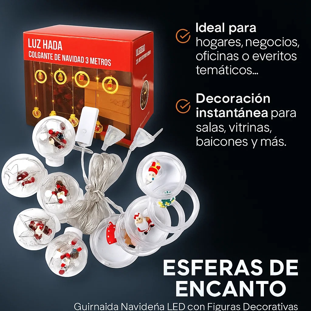 Las Esferas de Encanto llegaron para revolucionar tu Navidad con un diseño único que mezcla luz cálida y figuras navideñas adorables dentro de esferas transparentes. Una guirnalda de 3 metros que cautiva, emociona y transforma cualquier espacio en un escenario mágico digno de postal.